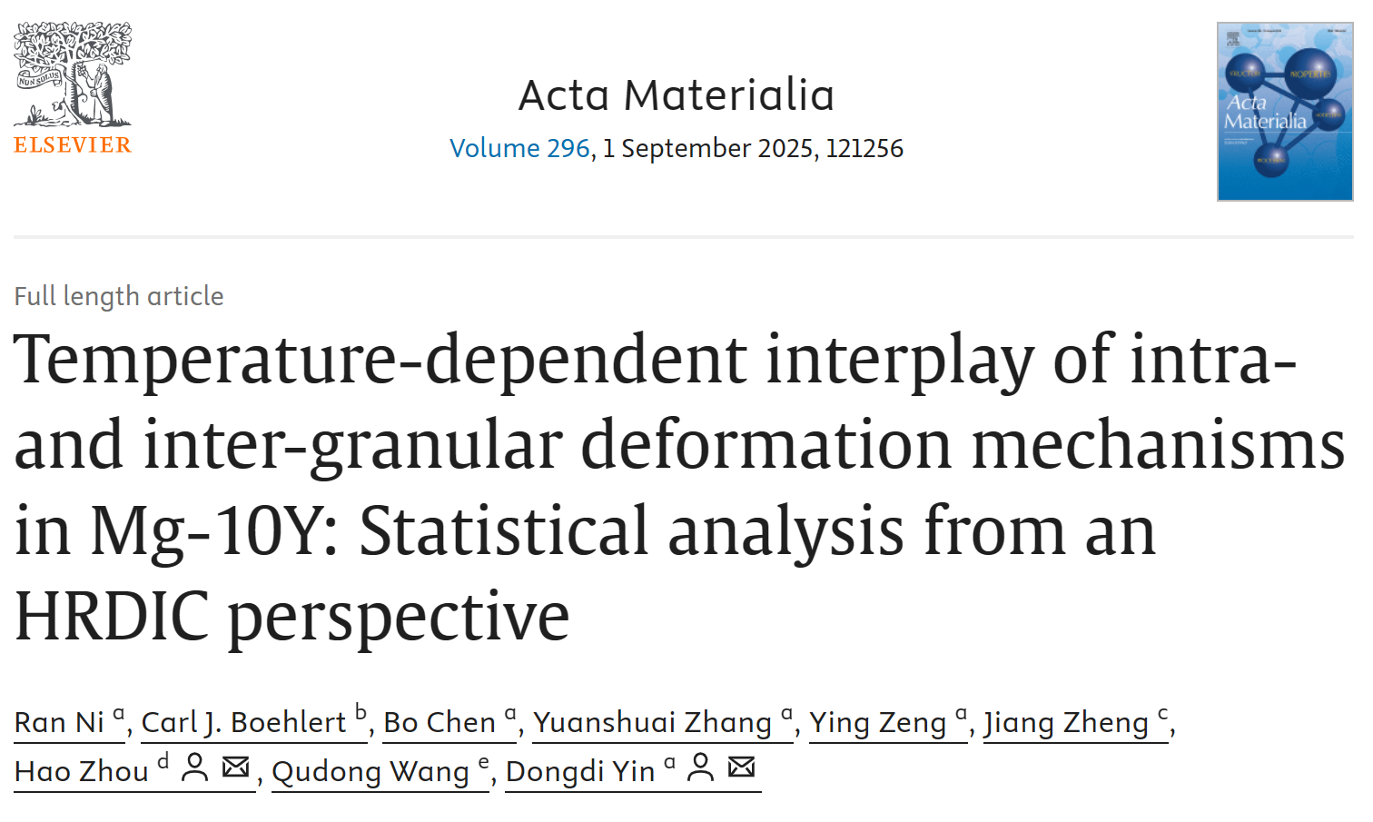 尹冬弟教授、博士生倪然联合辽宁材料实验室周浩研究员等基于自主开发的晶粒变形多模态自动分析框架(AutoGrainDAM,Int. J. Plast. 182 (2024) 104119),针对当前研究通常孤立考察晶内或晶间变形的局限,结合HRDIC与EBSD数据融合技术,定量统计分析了Mg-10Y合金在单轴压缩过程中多种变形机制及其应变分配的温度依赖性。统计样本共计约4500万个应变测量数据点。该研究完整清晰地揭示了晶内各滑移模式与晶界滑动间的竞争与协调关系,同时量化了滑移带与晶粒表层在应变分配上的竞争。这为解释镁稀土合金中非基面滑移活性随温度升高而降低的反常现象提供了合理机制,并再次凸显了研究多晶变形同时考量晶内与晶间变形机制的重要性。相关工作以“Temperature-dependent interplay of intra- and inter-granular deformation mechanisms in Mg-10Y: Statistical analysis from an HRDIC perspective”为题发表在金属材料领域高水平期刊《Acta Materialia》。论文主要合作者还包括密歇根州立大学Carl Boehlert教授、重庆大学郑江副教授、上海交通大学王渠东教授等。