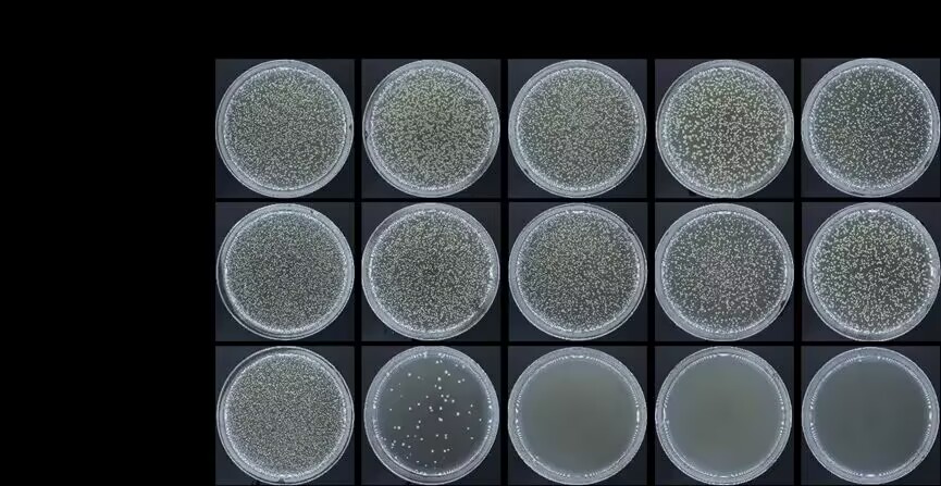 图 8. 市售口罩纤维膜、纯 PAN 纳米纤维膜和Cu2O@PAN纳米纤维膜分别在可见光照射下进行光催化杀灭大肠杆菌实验后的培养皿照片