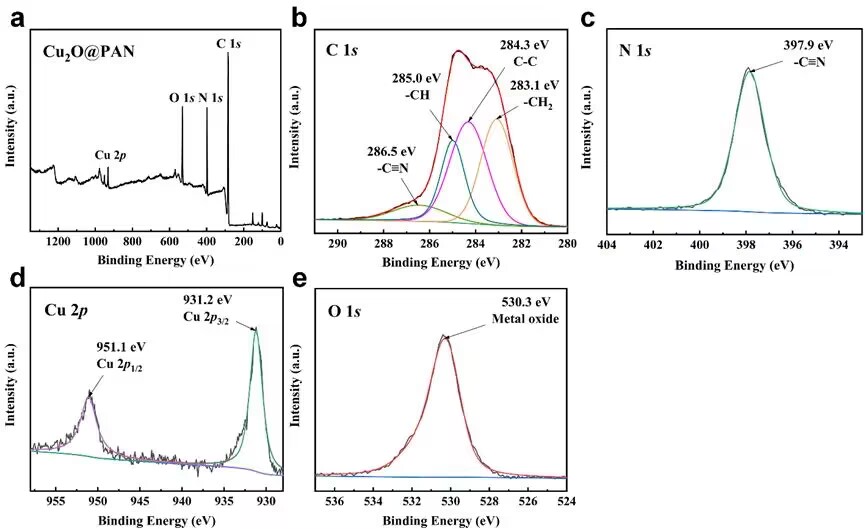 图3. (a) Cu2O@PAN复合纳米纤维薄膜XPS谱图。Cu2O@PAN复合纳米纤维薄膜的 (b) C 1s、(c) N 1s、(d) Cu 2p和 (e) O 1s区域高分辨率XPS谱图。
