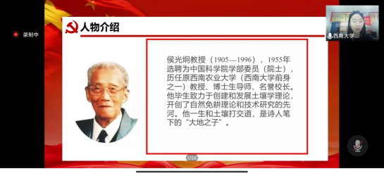 接下来,西南大学资源环境学院本科生土管党支部的党钰钰分享了“大地之子”——侯光炯院士的传奇故事。侯院士一生扎根在土地里,把自己的全部,都献给了党和人民。侯老在学校,学为人师,行为世范;在生活中,淡泊名利,无私奉献。侯老的一生,强国富民;矢志不渝,情系三农,躬身实践;奉献如土,劳作似牛。