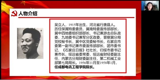 最后由电子科技大学微电子与固体电子系研究生第一党支部刘琼分享吴立人院长的故事。吴老一生忠于党,永葆着“人民儿子”的本色。在土地革命时期,用生命播下火种;十四年抗战,为民族独立而英勇奋斗;致力投身新中国建设,担任成都电讯学院院长。吴老的一生,是革命的一生、战斗的一生,他一生致力于教育工作,为党的人才培养工作作出了重大贡献。