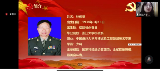 浙江大学环资学院土水所研究生第一党支部刘小婷同志为大家分享林俊德将军“干惊天动地事、做隐姓埋名人”的故事。林俊德将军在罗布泊一呆就是五十年,面对重重困难,不畏艰辛,及时完成任务,在1967年6月17日,中国第一颗原子弹爆炸后,林将军带领团队徒步十几公里,完成了原子弹爆炸参数测量。林将军临终前仍在坚持工作,将自己的一生献给共和国的国防事业。