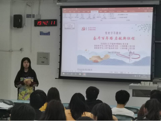 本科生第一、第二党支部邀请马克思主义学院2019级硕士党支部的同志开展党史学习教育专题讲座。本次活动由本科生第一党支部书记代宇欣主持。
