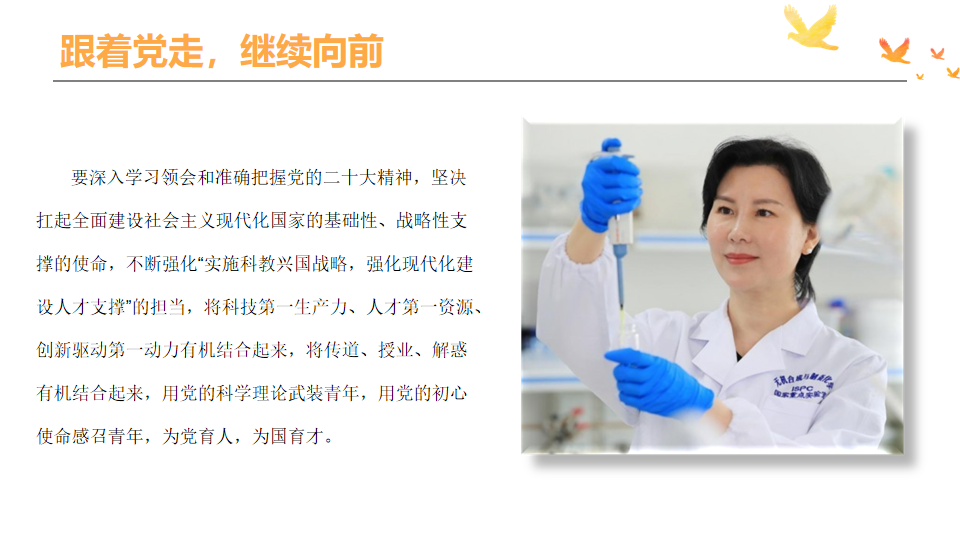 来自学院本研各学生党支部的学生代表分享党的二十大代表中的科学家风采。李振威同学分享了被誉为“世界菌草技术之父”的林占熺院士的故事,他号召同学们学习林院士求真力行的品质,踏踏实实做好每一件事情。孙熙桐同学分享了致力于乡村振兴、科技扶贫的“农民院士”朱有勇的故事,他表示作为新时代青年,要在科创中增强问题意识,看到质朴问题中的大学问,始终不忘作为新时代青年的责任和担当,像朱有勇院士一样,把论文写在祖国大地上,把科研做到人民的心中。杨峰同学介绍了“航天事业的攀登者”李得天院士的故事,他认为,作为一名研究生党员,要学习李院士在“孔雀东南飞”的潮流中坚持自我实现的本心,打造“飞天”本领的耐心,面临困难能够迎难而上的恒心。康娜同学作为新生入党积极分子代表分享了中国科学院分子细胞科学卓越创新中心研究员陈玲玲的故事,表示要坚定不移听党话,跟党走,敢想敢做又善作善成,在学习中不断践行科学家精神。胡烨同学分享了致力于分子筛纳米孔材料研究的于吉红院士的故事,表示要学习她不慕名利、潜心研究的奉献精神,将个人追求融入建设社会主义现代化国家的伟大事业中,把个人的成长成才融入祖国的伟大发展中。崔晨同学分享了歼-20战斗机总设计师杨伟院士的故事,鼓励同学们志存高远,坚定理想信念,学习杨伟院士的锐意创新的精神以及实事求是、艰苦奋斗的做事态度。