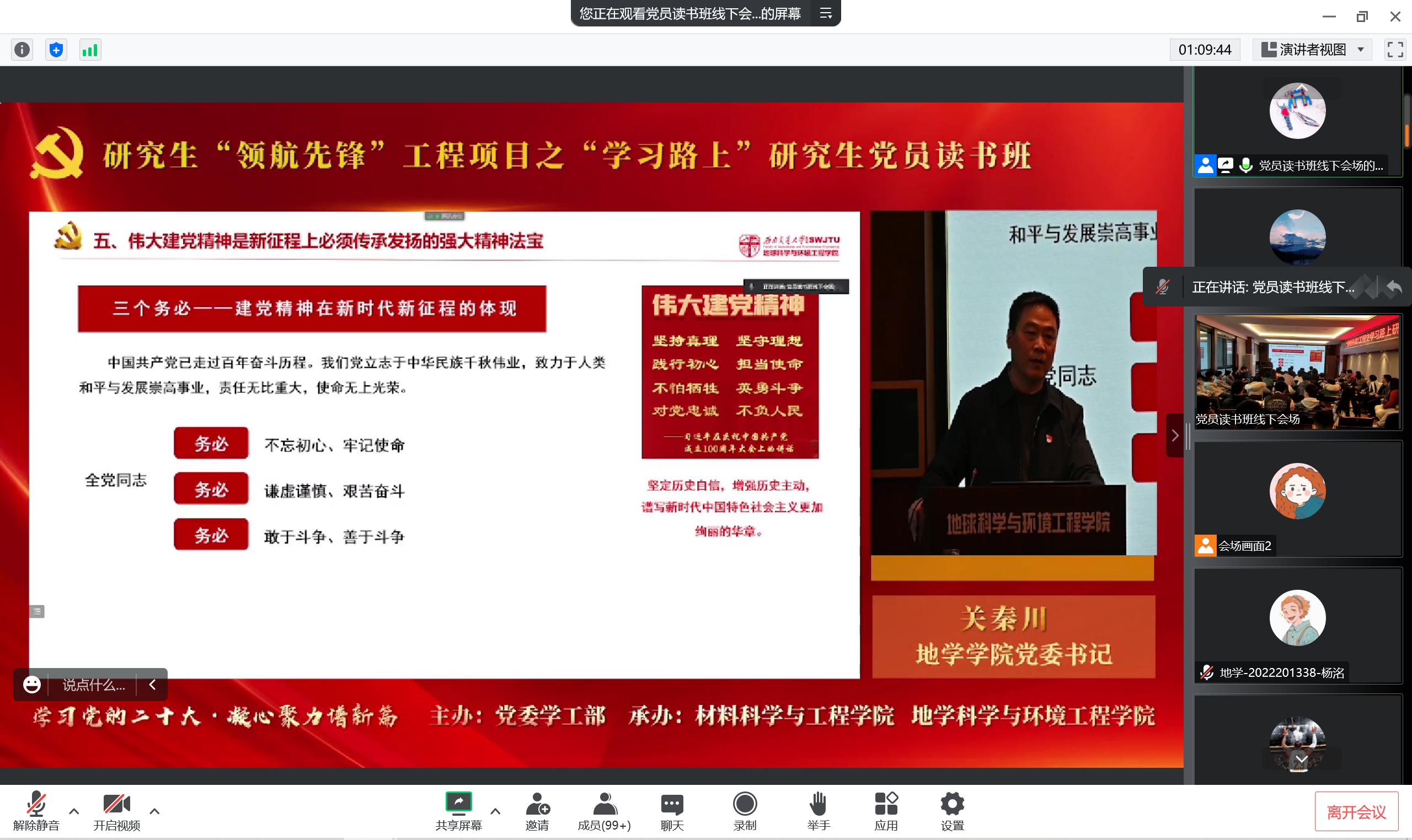党委以线上线下结合的方式共同开展“学习二十大·启航新征程”研究生党员读书班讲座。本次讲座由地学学院党委书记关秦川主讲,地学学院学生党建负责人文强主持,地学学院研究生党员代表于X4520线下学习,鉴黄师