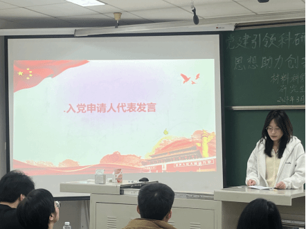 会议第二项,入党申请人代表柯丽娜上台发言,她表达了对党的热爱和对科研事业的信心与决心,未来将以更加积极的态度投入到党的组织生活中,努力学习党的理论知识,不断提升政治觉悟和思想境界,早日成为一名合格的共产党员。