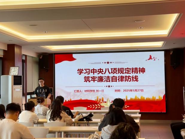 刘一江同志带领全体党员深入学习中央八项规定精神。他结合高校研究生党支部工作实际,从改进工作作风、密切联系群众等方面进行了细致解读与深刻剖析,引导党员们深刻认识到中央八项规定精神的重要意义和实践要求,强调要将其内化于心、外化于行,在学习和生活中发挥党员的先锋模范作用,营造风清气正的支部氛围。