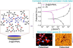 Bone fracture remains a major public health concern. Internal fixation devices are commonly used in clinical practice for the bone healing. Nowadays, permanent or non-degradable metals are utilized for the fabricating materials, which brings about inevitably side effects and requires usually a second surgery to remove the implants after the bone healing. The concept of biodegradable becomes a new paradigm for the next generation of bone fixation implants and Zn-based metals have been considered as the leading candidate materials. However, their uncertain degradation/corrosion behavior as well as insufficient bio-compatibility/-functionality hinders their clinical translation. Surface modification offers a great avenue to address this key issue, most of current research remains still far from satisfactory from the standpoint of clinical application. Recently, a novel alendronate embedded zinc phosphate hybrid coating was constructed on Zn by Prof. Guojiang Wan’s group, which has been published on the academic journal Corrosion Science. The hybrid coating combined the desirable corrosion protective property and potential bio-compatibility. Thanks to its high quality, the hybrid coating serves as a effective kinetic barrier to slow down the corrosion rate of Zn as well as reduce the Zn2+ release. Moreover, the coated Zn turned to a more uniform corrosion mode, free of severe localized corrosion, which is beneficial to maintain a structural and mechanical integrity of the implants during the degradation process. More importantly, the coating shows a great potential for bone repairing functionality with a good balance between the bone formation and resorption.